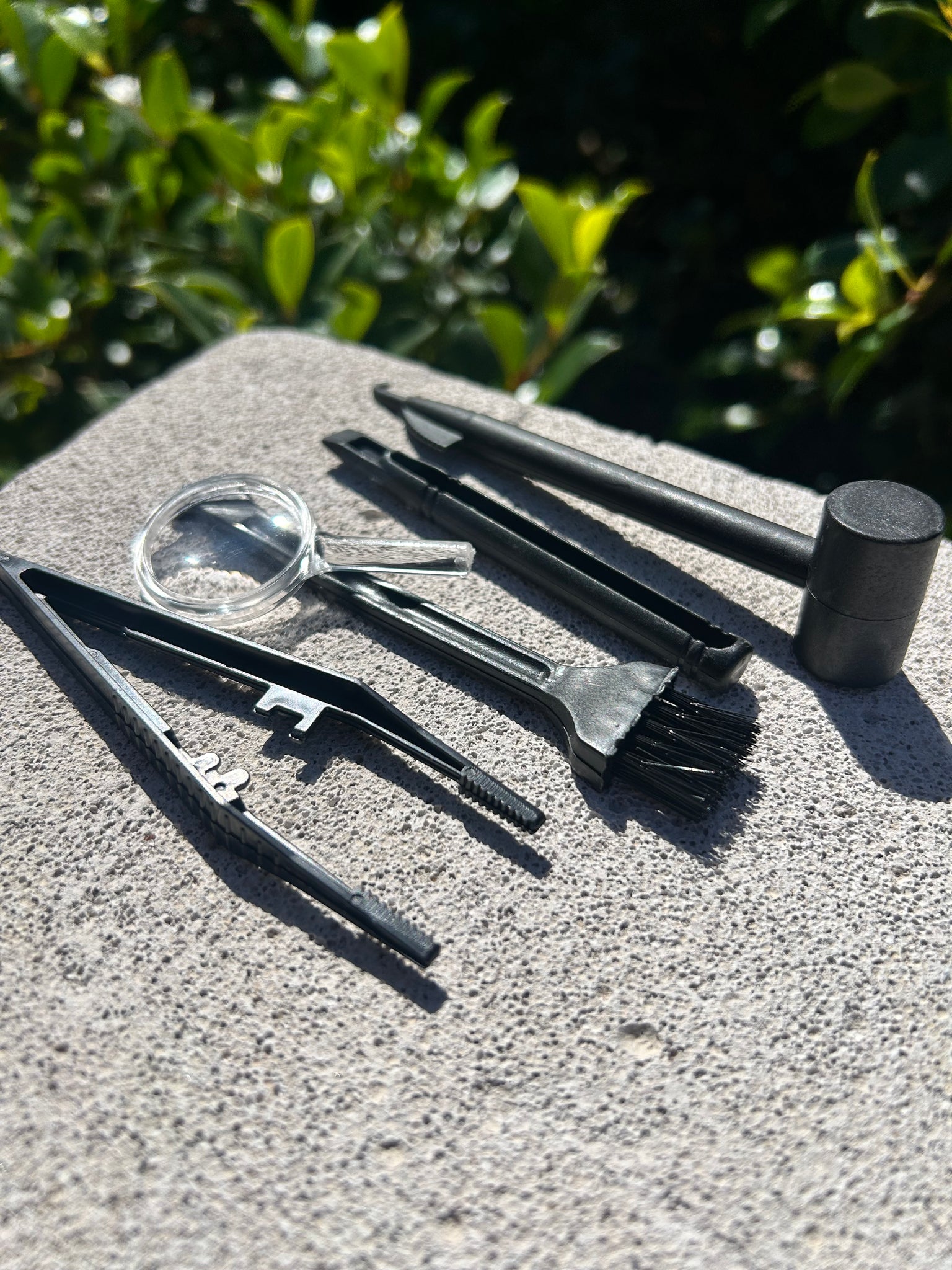 Included is little black plastic tools to help discover the element of surprise.